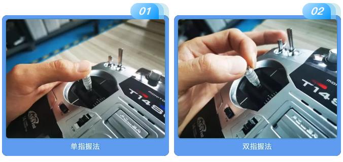 在進行(xing)模擬/實操(cao)飛(fei)行(xing)前,要熟悉遙控器正確(que)的握法(fa)(fa),養成良(liang)好的飛(fei)行(xing)習慣(guan),握法(fa)(fa)有兩種:單指握法(fa)(fa)與雙指握法(fa)(fa),如下圖所示:個人見意是(shi)用(yong)雙指握法(fa)(fa)操(cao)作會更精(jing)準些。
