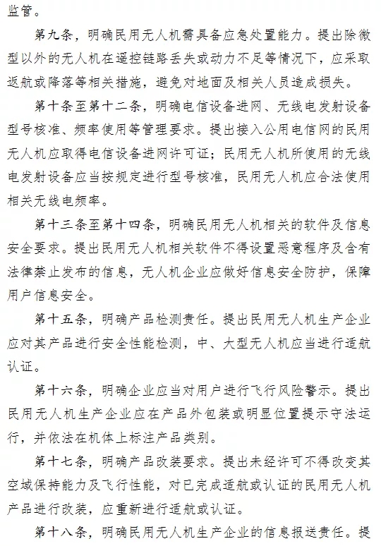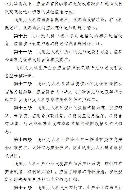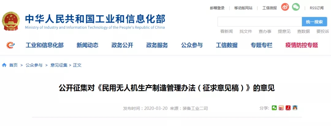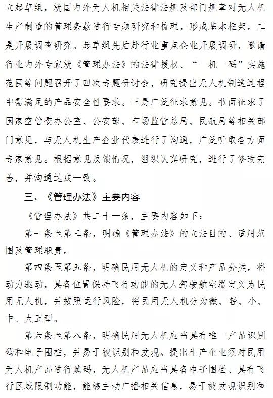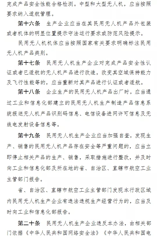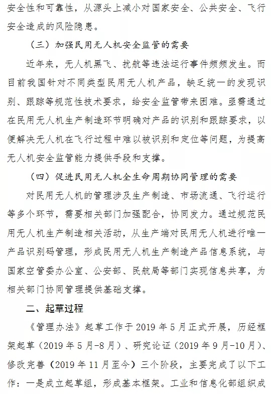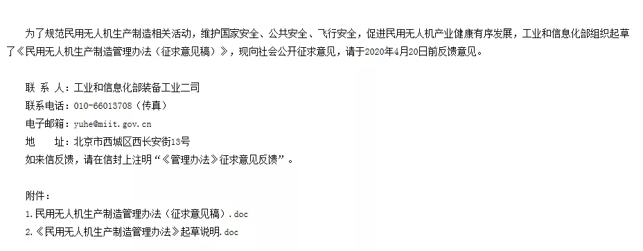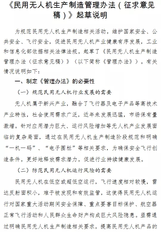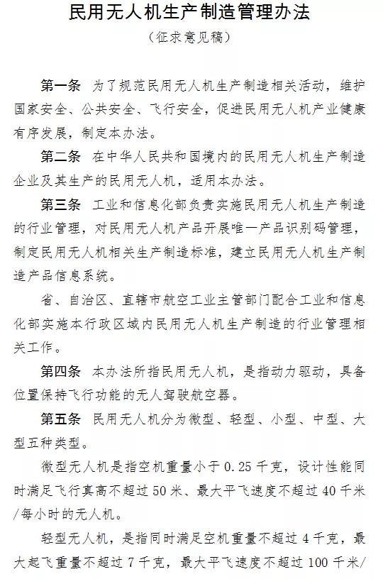 工信部今天正式就《民用無人機生產制造管理(li)辦(ban)法(fa)(征(zheng)求(qiu)意(yi)見稿)》向全社(she)會(hui)公開征(zheng)求(qiu)意(yi)見,本次意(yi)見征(zheng)集截止4月20日。