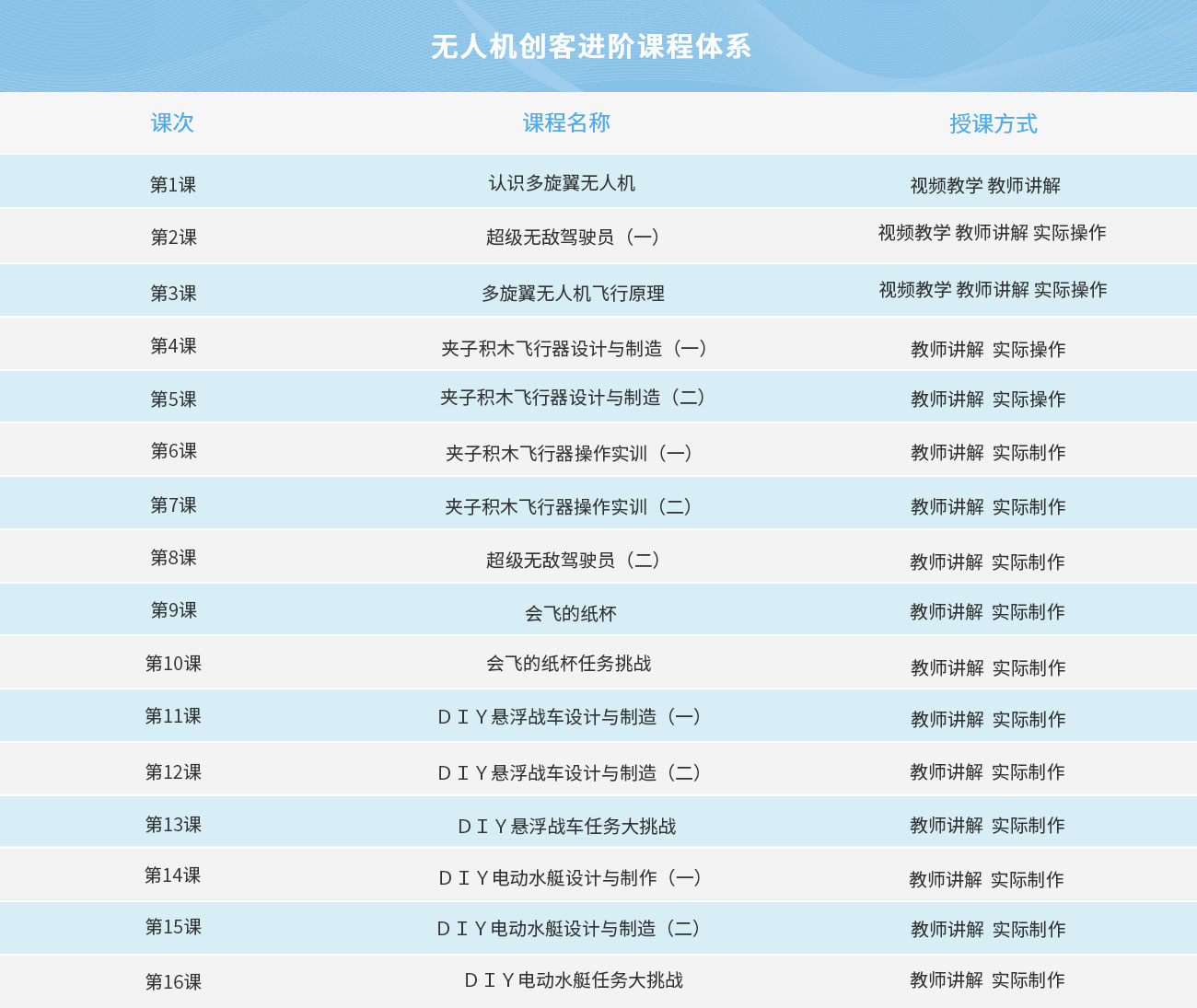 本(ben)課(ke)程(cheng)主要授(shou)課(ke)對象為(wei)(wei)小學一至(zhi)三年級的(de)(de)(de)學生,課(ke)程(cheng)通(tong)過更加(jia)深入的(de)(de)(de)學習來(lai)了解(jie)多(duo)(duo)旋翼(yi)無(wu)人(ren)(ren)(ren)機(ji)的(de)(de)(de)結構組成以(yi)及它的(de)(de)(de)飛行操控,以(yi)無(wu)人(ren)(ren)(ren)機(ji)的(de)(de)(de)設(she)計和創造作(zuo)為(wei)(wei)平(ping)臺講解(jie),用發散性思維來(lai)拓展更加(jia)多(duo)(duo)元(yuan)化的(de)(de)(de)DIY設(she)計創作(zuo),親自打造既(ji)能上天也(ye)能入海的(de)(de)(de)獨(du)特“無(wu)人(ren)(ren)(ren)機(ji)”